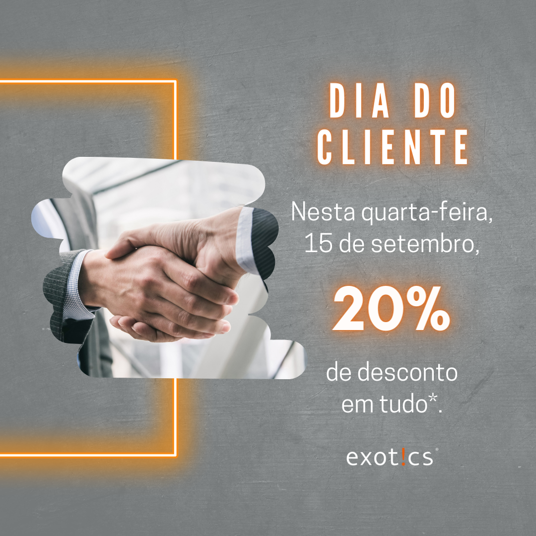 Em homenagem ao Dia do Cliente, somente nesta quarta-feira, 15 de setembro, clientes novos e antigos ganham 20% de desconto sobre o preço de tabela* na aquisição, upgrade ou renovação de qualquer sistema Exotics.