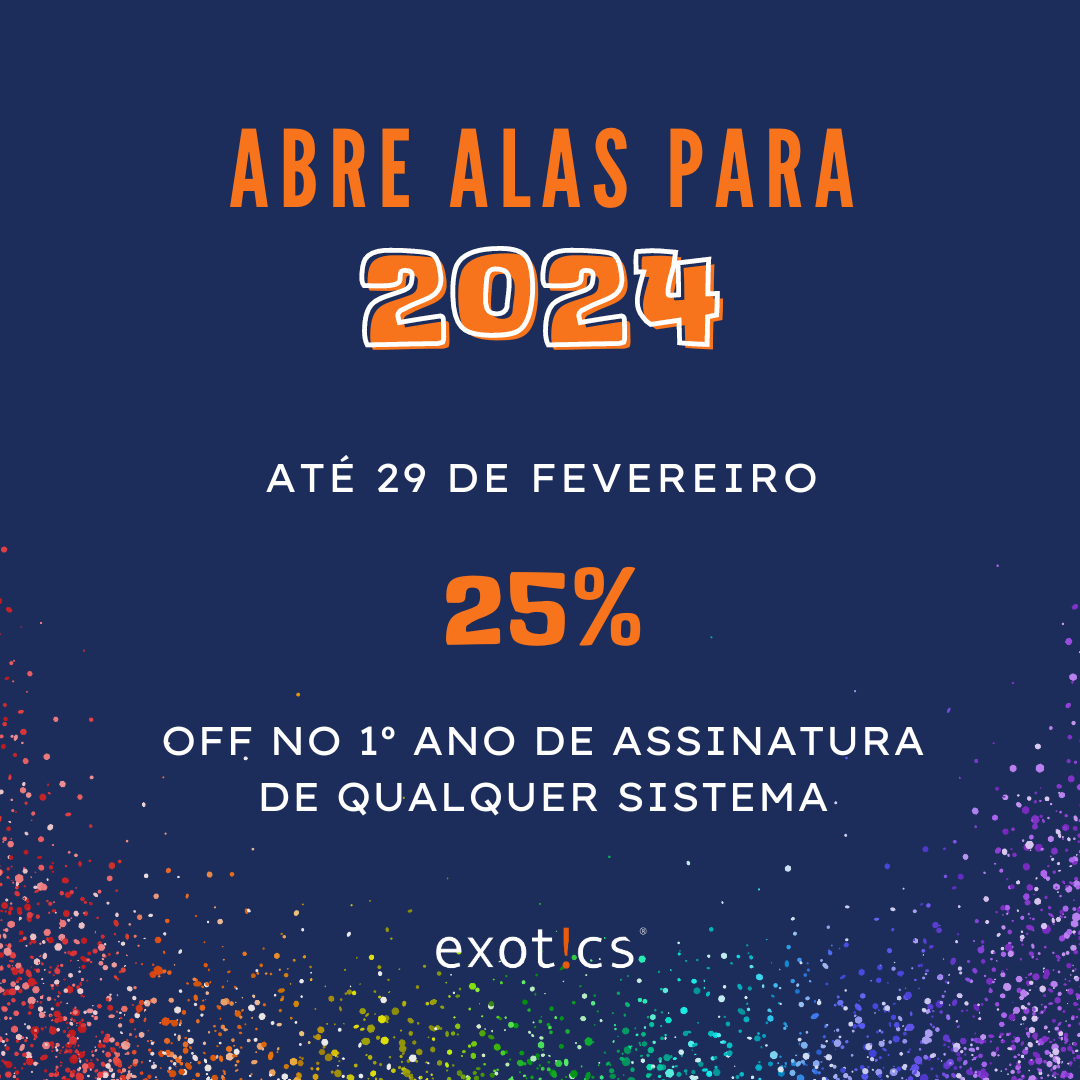 Para receber efetivamente 2024, preparamos uma promoção especial que vai até o fim deste mês. Aproveite o período para fazer uma assinatura nova de um dos sistemas Exotics e contar com 25% de desconto no primeiro ano.